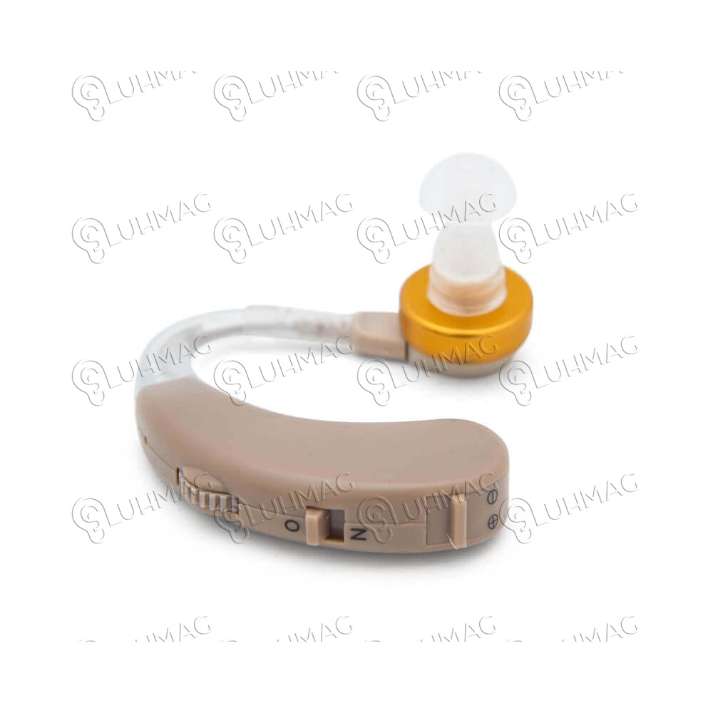 Слуховой аппарат заушного типа с высокими эксплуатационными свойствами. Аппарат обладает высокой мощностью звука при достаточно широкой полосе пропускания звуковых частот и малом коэффициенте нелинейных искажений. Прибор мало заметен в силу специальной формы и цвета корпуса. Ушной телефон имеет несколько ушных вкладышей. Для хранения прибора и вкладышей предусмотрен удобный футляр.